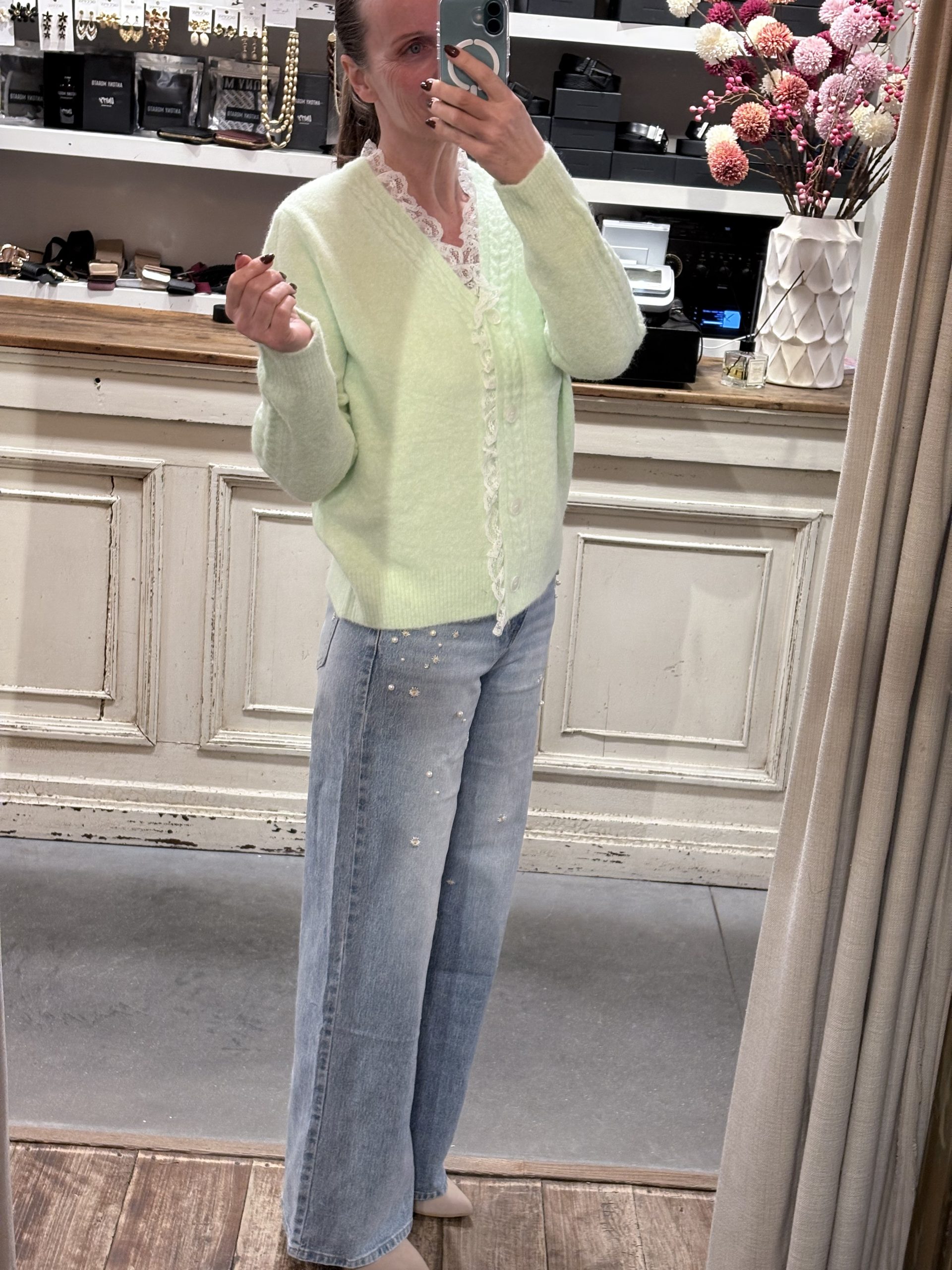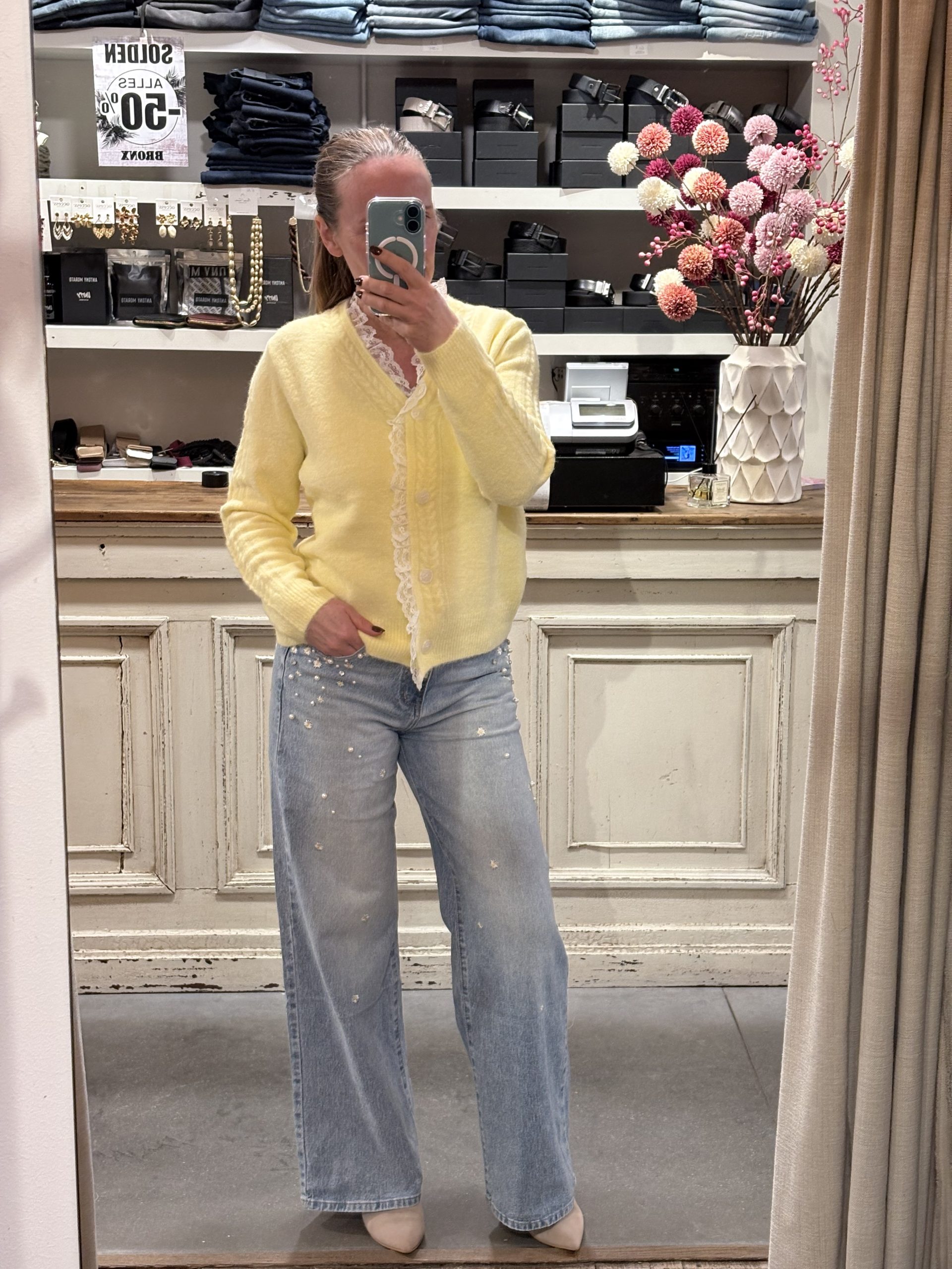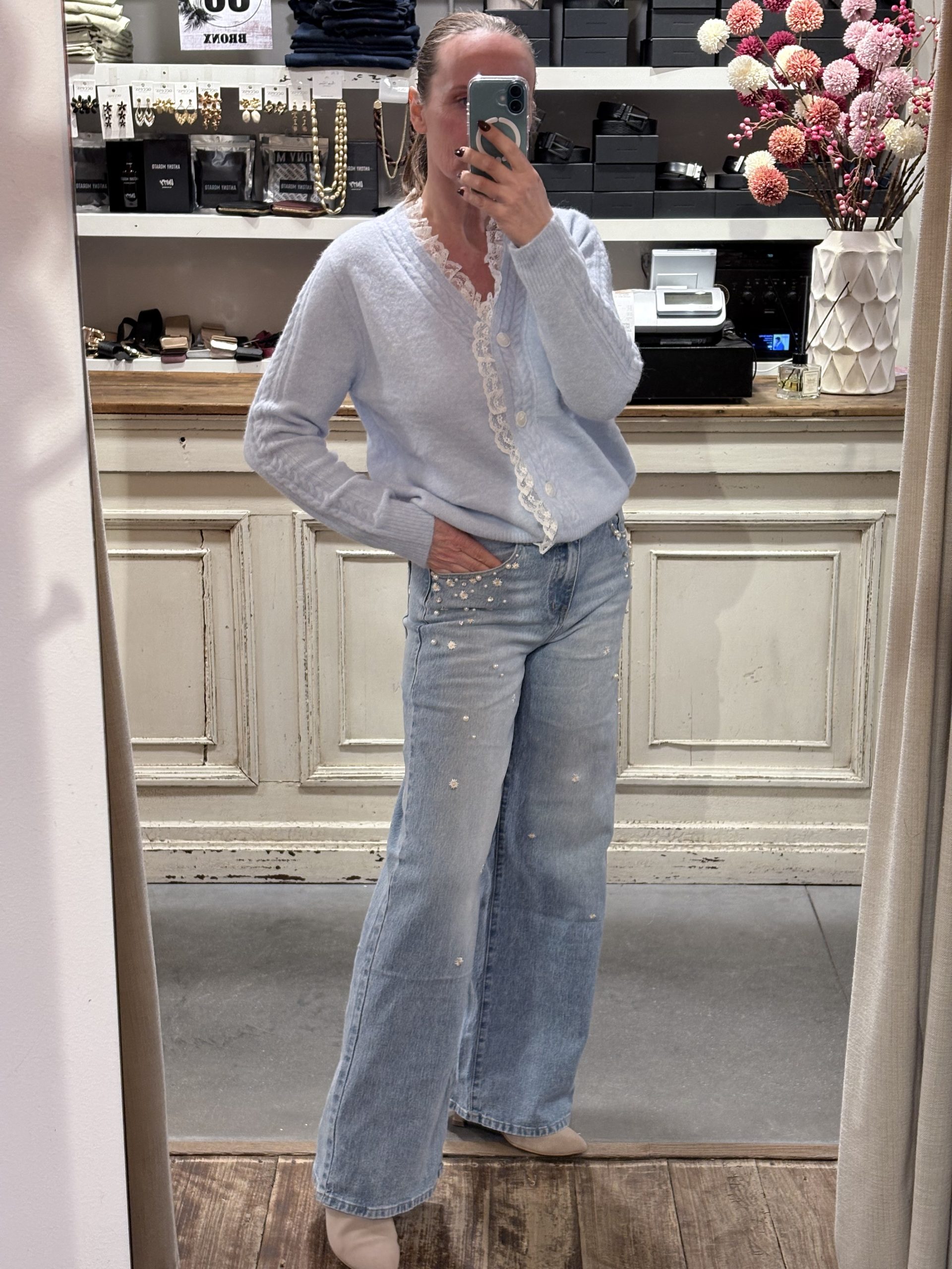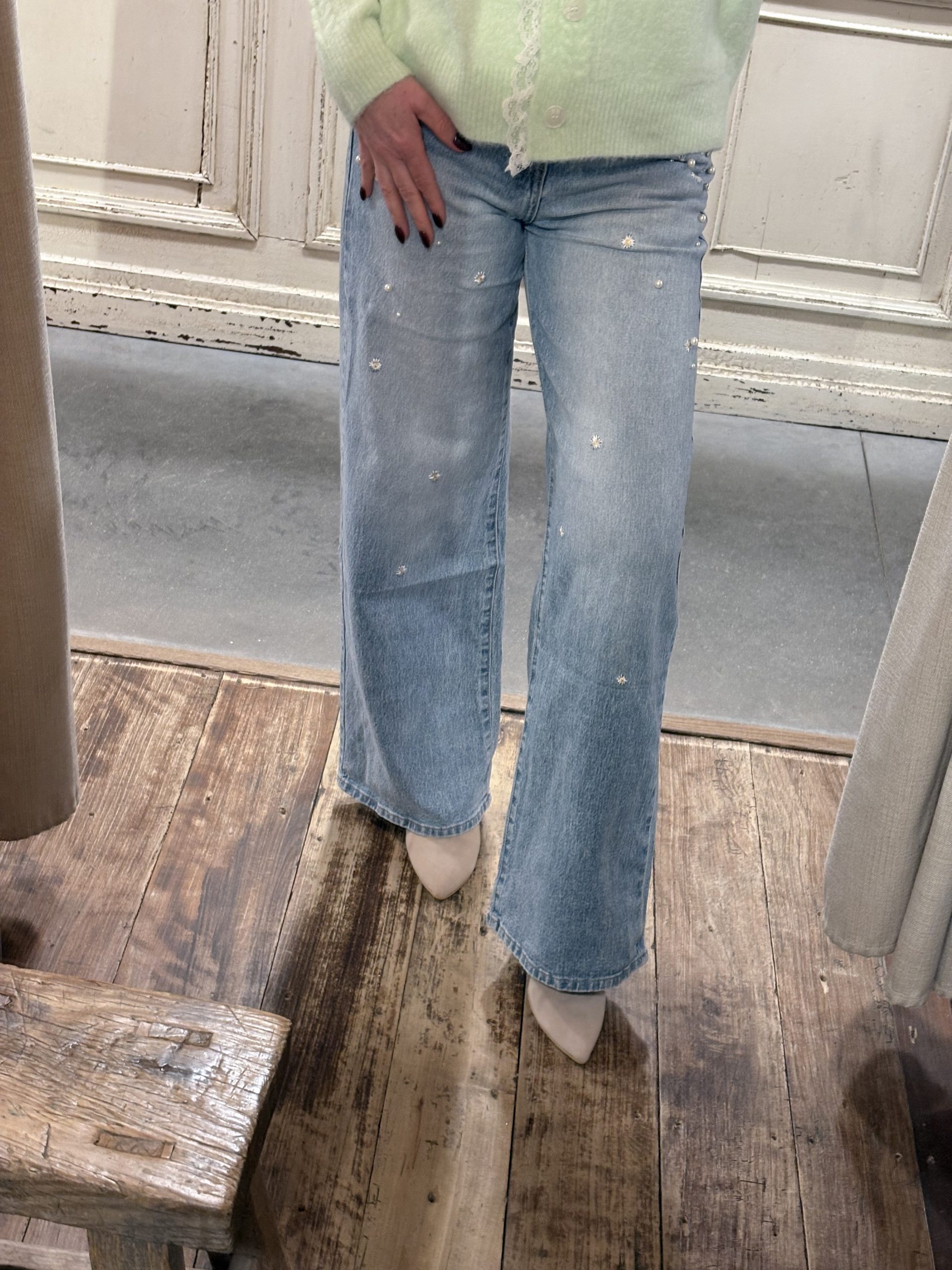 Jeans/ regular high waist met bloem/ parel & stras detail Valt op maat